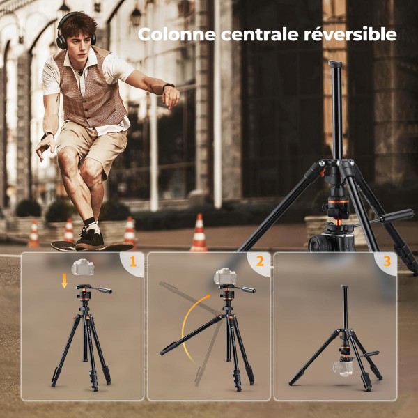 Réalisez des panoramas à 360°, des prises de vue verticales, horizontales ou au ras du sol. La colonne centrale est réversible pour la macrophotographie, et le manche de la rotule est détachable pour une ergonomie personnalisée.