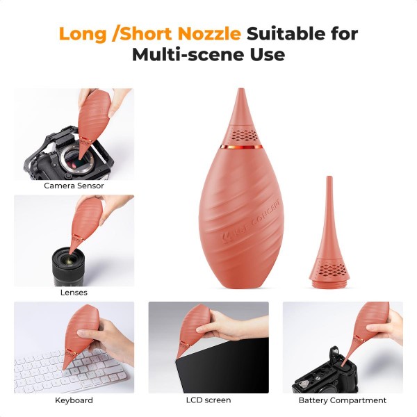 L’embout long est plus adapté au nettoyage des zones plus profondes telles que les capteurs DSLR et les compartiments de batterie d'appareil photo. La buse courte est plus adaptée au nettoyage des objectifs, des filtres, des capteurs sans miroir, des surfaces du corps et des objectifs.