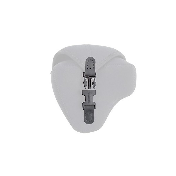 Il dispose d'une sangle de maintien unique qui se fixe autour de l'objectif et permet à l’étui de rester attaché à l'appareil photo lors des prises de vue.