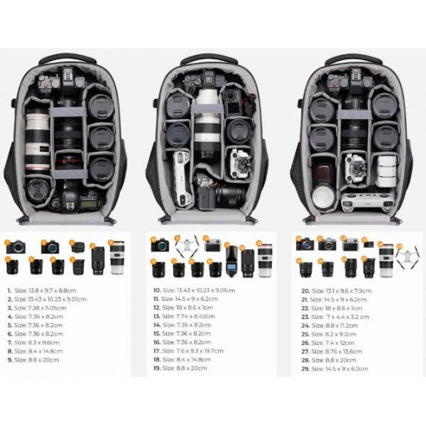 Les inserts modulaires amovibles servent de séparateurs individuels pour différents appareils photo, flashs et objectifs.
