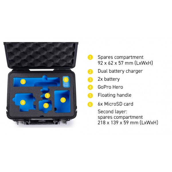 Grâce à son insert en mousse personnalisée, il offre suffisamment d'espace pour la GoPro Hero 9/10/11/12/13 et les accessoires : le double chargeur de batterie, jusqu'à 3 batteries, jusqu'à 7 microSD, des supports de montage et des câbles.